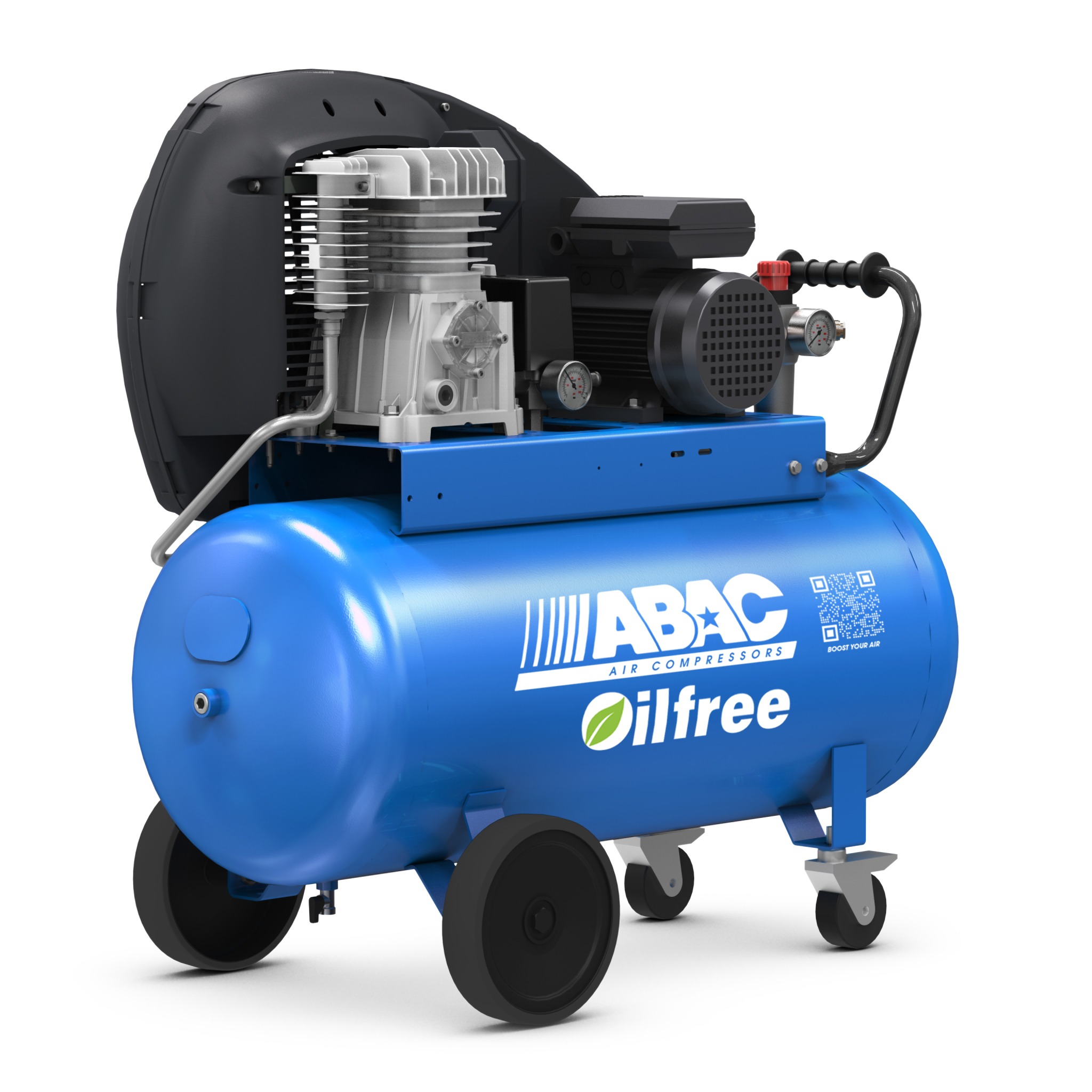 Compresor Abac Oilfree de 3 hp y depósito de 100 litros. Exento de aceite y libre de contaminación. Al ser un compresor sin aceite, no hay que retirar el aceite degradado, de tal modo, que tanto las herramientas como el suelo, permanecerán libres de grasas. Menores costes de mantenimiento, más duración de la vida útil de la máquina. Con ruedas robustas para su mejor movilidad.