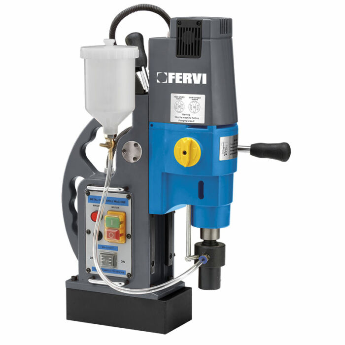 Taladro magnético de la marca Fervi con equipo de refrigeración para fresas de hasta 50 mm con mango weldon de 19.05 mm de diámetro con brocas con mango cónico cm3 y de hasta 20 mm de diámetro. Ideal para hacer taladros en sitios de difícil acceso.